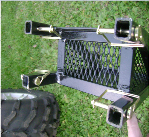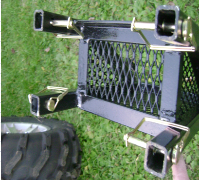 The Flip Guard Carrier Model or the Sport Model can be attached to the Assembly on the Grizzly ATV by removing the 4 quick pins, then sliding the the Flip Guard onto the four square bars of the Assembly and then reinserting the 4 quick pins and then locking into the closed position. Ensure that the locking arm of the quick pins do not hang down where the terrain could dislodge them out of the holes in the Flip Guard. Insert pins as in per picture. (Locking arms are kept to the inside of the Flip Guard.)