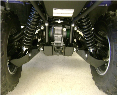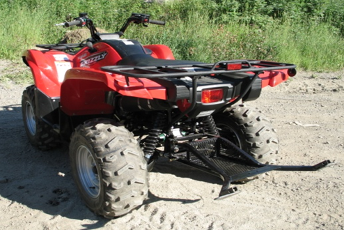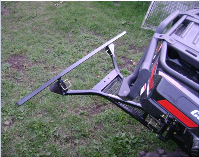 A back view of the Grizzly model. The Quad-Rite Flip Guard will attach onto the back end of Grizzly Models. The 660 Grizzly Quad-Rite Assembly is slightly different than the 550/700 Assembly but both attach onto the back end of the Grizzly the same way: Connects onto the 2 back vertical pipes and also the 2 holes of the factory hitch plate location.