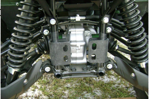 This procedure is repeated for the next 3/8" x 6" bolt and the 2- 3/8" x 1 1/4""bolts. Next, the plate with 4 holes is placed over the undercarriage of the Can-am A.T.V. and aligned with the 4 holes in the Assembly. The four bolts, 8 washers and 4 lock washers and 4 nuts are finger tightened. Next all the bolts holding the Assembly onto the A.T.V. are tightened.